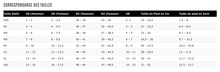 Le tableau des tailles montre la conversion en tailles Femmes, UE et Royaume-Uni.
